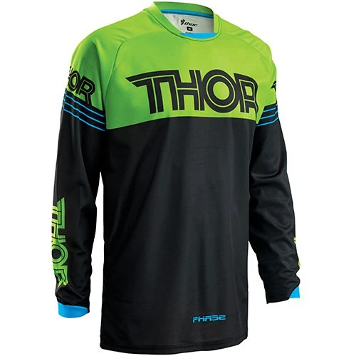 THOR 2016 Phase Hyperion jersey features:100% moisture wicking polyester fabric to help keep you dry and coolRaglan style sleeves for greater mobilityStretch knit cuffs and collar for less restriction around the neck and wristsSublimated graphics to resist fading